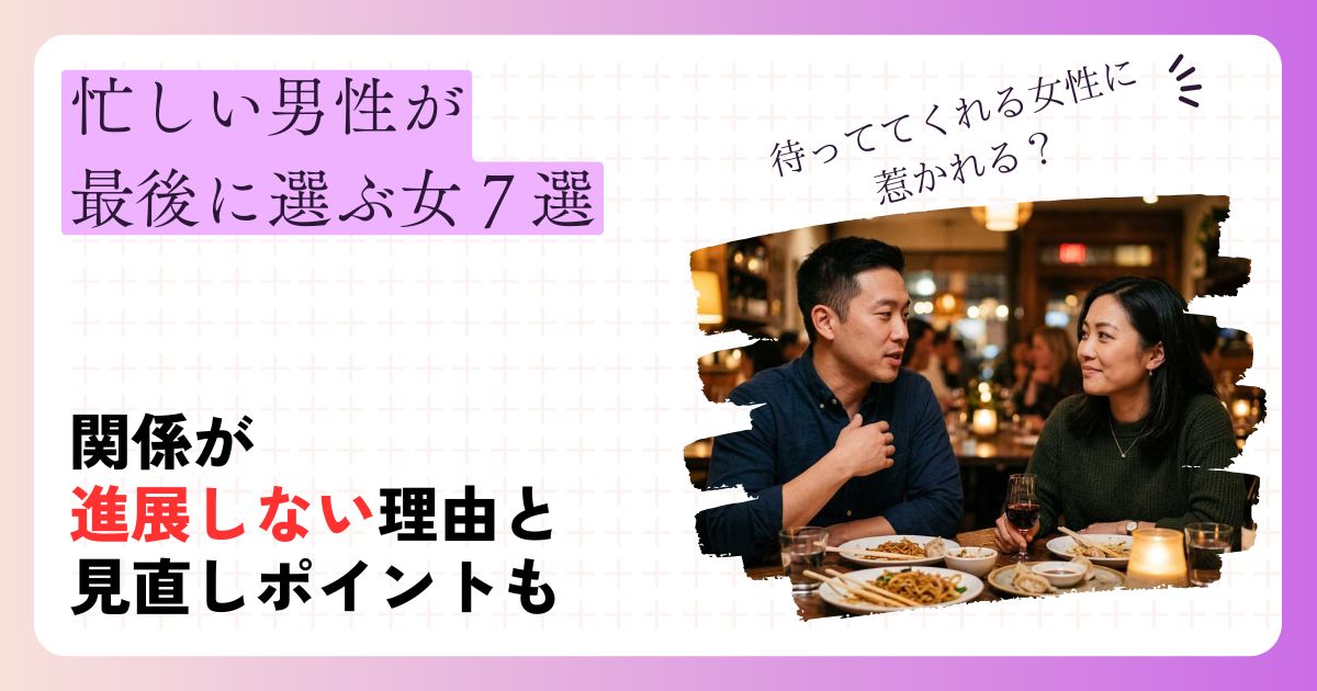運営者目線で見ると、「忙しいのに本気なのか分からない」と悩む女性は多いですが、忙しい男性が最後に選ぶ女には共通点があります。それは、追いかけさせる駆け引きの上手さよりも、現実的な思いやりと安定感を持っていることです。恋愛の盛り上がりだけでなく、日常の相性まで見据えられる女性ほど、最終的に選ばれやすい傾向があります。